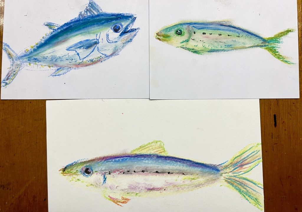 夏休み中には、神栖市横瀬小学校の家庭教育学級の活動にて絵画教室を行いました。夏休みの課題の中にある海の子絵画展などに活かせるように、クレヨンで混色しながら魚を描きました。真鰯や鰹など身近で、近隣の銚子港で漁れる魚をメインに練習しました。とっても意欲的な参加者の皆さんと楽しい1日でした。
