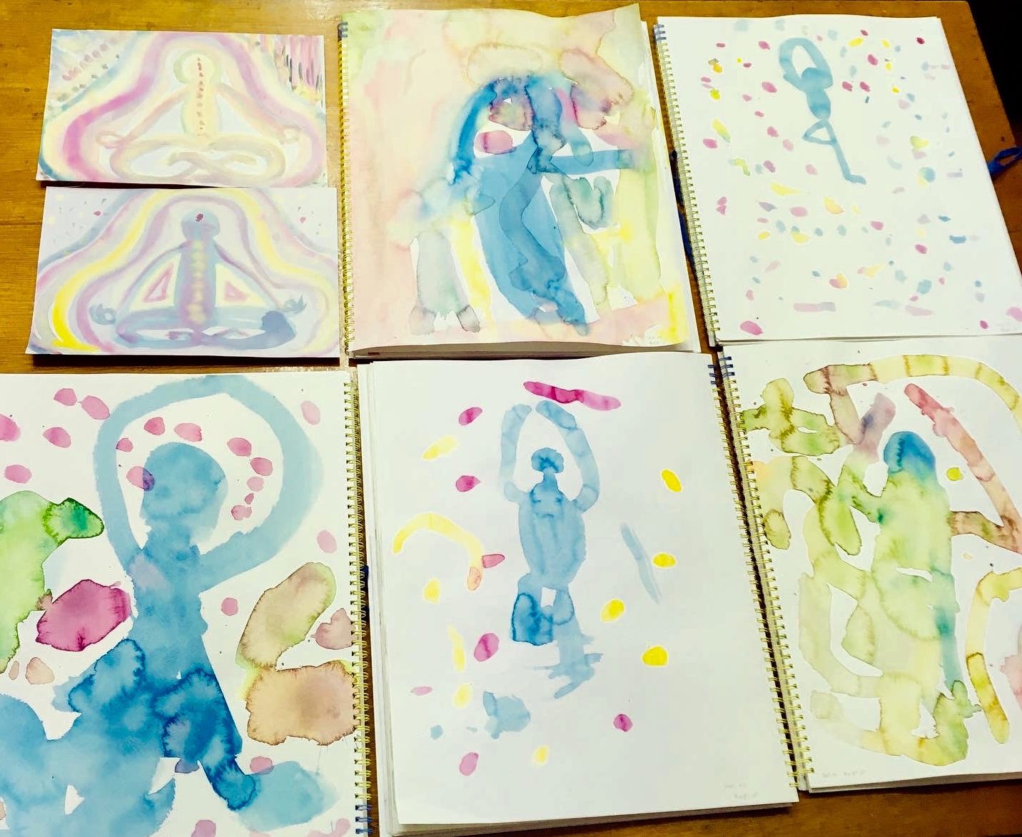 2021年のアトリエのテーマはカラダです。2月のアトリエではヨガのポーズや瞑想でカラダと心に意識を向けて、カラダを描いたり紙を切り抜いて形を創る体験をしてから、ピエロの面白いポーズの制作に入って行きました。ポーズをとる時に力の入り方やカラダの連動や繋がりに意識を向ける声掛けをしたことで、しっかりとしたカラダの形を捉えた作品になってきています。ポーズをとってカラダを動かした後に少し静かな時間を取り戻すために瞑想にもチャレンジしました。難しいかなと思っていたのですが、子ども達は興味を持って取り組んでくれました。雑音を消して内側の静けさに浸った後の子ども達の目はなんだかいつもと違って、イメージの力が宿っているように見えました。そのイメージをこぼさないように粛々とその後に水彩画に取り組む姿はとても印象的で、時々また取り入れたいなと思っています。