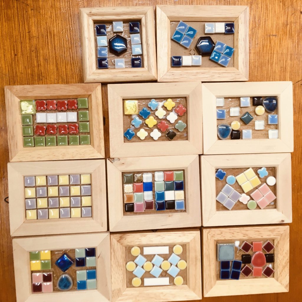 10月のアトリエでは、これまでの色と構成の学びを生かしてタイルプレートの制作をしています。材料の美濃焼きのタイルは色がとても綺麗でこども達はみんなワクワクと一粒一粒選んで並べています。大粒タイルはまとめ売りのアソートで購入した為、欲しいものが他の人とかぶってしまった場合声を掛け合ってジャンケンで決める場面がありました。どうなるかと見守っていたのですが、とても素敵なやりとりがありました。ジャンケンで譲って貰ったタイルを試行錯誤の末、結局は使わないことに決めた女の子がいました。するとその子は譲ってもらった相手の男の子に自分から声を掛けて「これね、使わなっかたんだけど使う?」と渡しに行きました。何気ない行動かもしれませんが、教室の異年齢間では勇気のいる行動だったと思います。自分にとって大切な1粒が、相手にとっても大切なものだと理解してできた行動はとても心温まる出来事でした。他の場面でも教室終了後にタイルの選り分けを手伝ってくれた子がいたり、宝石のようなタイルに触れて、きれいだね!と言い合って、それぞれが嬉しそうに大切に扱ってくれる姿が随所にあり、とても嬉しかったです。完成品も早く持ち帰りたい!との声が多く、目地の乾燥を待たずに持ち帰る事となりました。絵画のように飾ったり、トレーとして使ったり活用して頂けたら幸いです。11月は、子ども達のもっとやりたい!の声に応えて1回目より少し大きなプレートにチャレンジしますので楽しみにしていて下さい