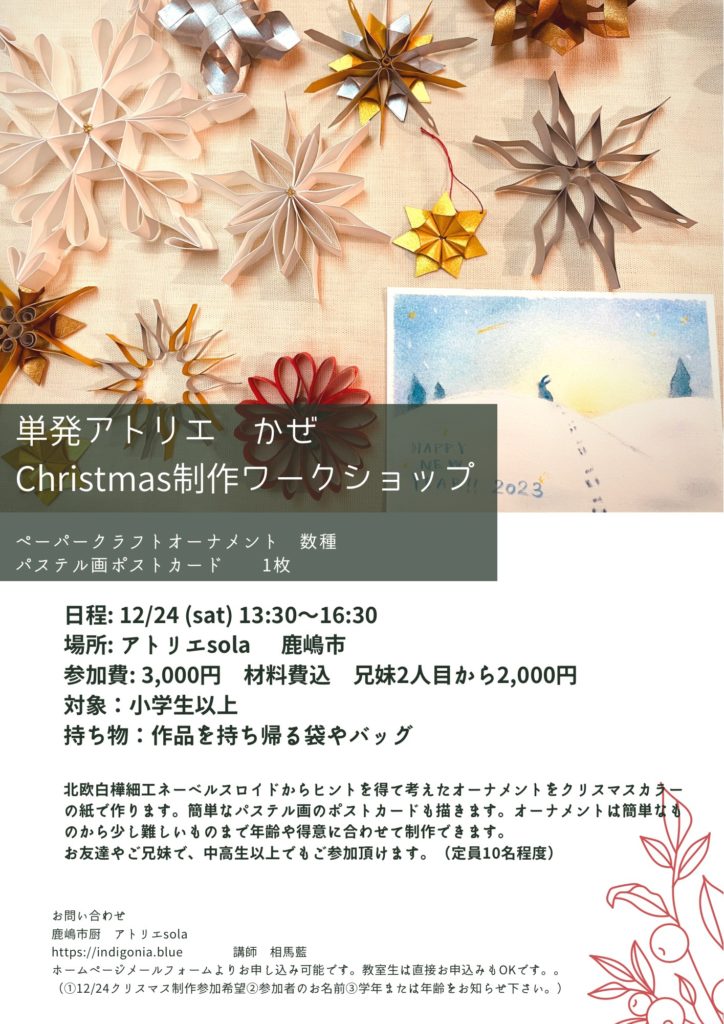単発アトリエかぜのお知らせです。クリスマスの足音が聞こえて来る季節となりました。24日クリスマスイブの午後たっぷり3時間のクリスマス制作を一緒に楽しみませんか?