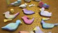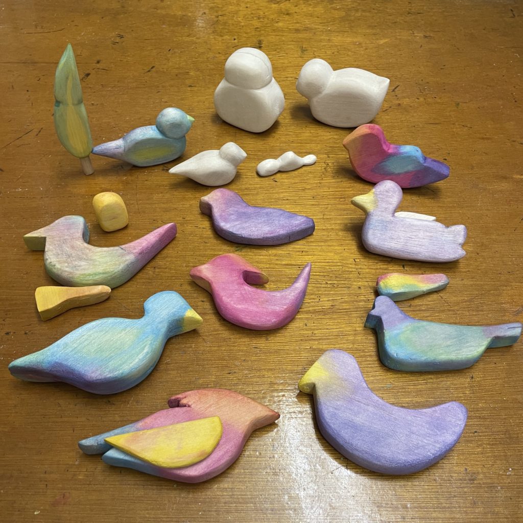 ↑作業の早い人は色付けに入っています。蜜蝋とアマニ油と顔料でカラーワックスを作りましたが、バルサ材には思っていたより薄く色が付くことや木口部分がむらなってしまうことがわかりました。そこで、透明水彩で色を付けた後にカラーワックスで研く事にしました。上の写真は水彩絵具で色をつけたところです。カラーワックスをうまく重ねればグラデーションなどの表現ができるかもしれません。完成まで後一息です。早い人は飾り方にもひと工夫できそうです。
